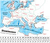 Dominanceof the old WorldThis game is meant to fill the niche occupied by Risk (and later by Vinci), while fixing the major problems with traditional Risk--so it ends up being quite unlike Risk. That niche, of course, is a simple, easy-to-play, abstracted wargame. Dominance has two boards, of Europe and of S.E. Asia, but no specific time period or technology. How Dominance meets the five complaints about traditional Risk Length. Risk can be very long. Dominance is about two hours, depending on the number of players and their experience. I think experienced players could keep it to 90 minutes. However, Dominance is a strategic game, and players typically like to think about their options. Too much Dice/luck. There are no dice in the standard version of the game. Variation is provided by Event Cards. (There is a more Risk-like version that uses dice but no Event Cards.) Downtime. Sometimes players wait too long for their turn. Dominance uses a "committed intent" Action Card mechanism. Players all play their card face down, then turn them face up and play in initiative order. This varies the turn order and limits what a player can do when it's his turn, so he's less likely to think about it for a long time when he plays. Employment of Mass. In Risk, 40 armies attacking 2 get no better results than 3 attacking 2. When a mass of armies is used, they should take effect. But in Dominance the number of armies is limited by territories owned, so no more than about 50 will be in play altogether. Player elimination. Since Dominance is a turn-limited point game, and players can submit rather than be wiped out, player elimination is quite rare. We end up with a simple, strategic game with lots of replayability.