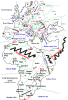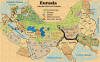 EurasiaHas been licensed to a publisher "2,000 years of history in 90-180 minutes". Two to five (six?) players control empires of Europe and Asia as they rise and fall, from the Romans to the Mongols. There are no chance elements in the game other than the choices of the players. This sweep of history game is free-flowing, somewhere between Britannia and History of the World. 17" by 26" board of Europe, North Africa, and most of Asia, and 175 pieces. For some years I've wanted to make a game with the virtues of Vinci (simplicity, quick play, diceless) but without the faults (abstract feel, "unrealism", severe leader-bashing and kingmaking, no economy). Eurasia has a board that actually matches reality, and the empires (and their special powers) are historical, yet it has free-form play rather than the so-called "scripting" of Britannia. It seems to be 90 minutes to two hours. It could be described as a cross between Vinci , History of the World , and Britannia. Yes, the board is the entire continent of Eurasia with N. Africa included! In 47 areas... see graphic below. |